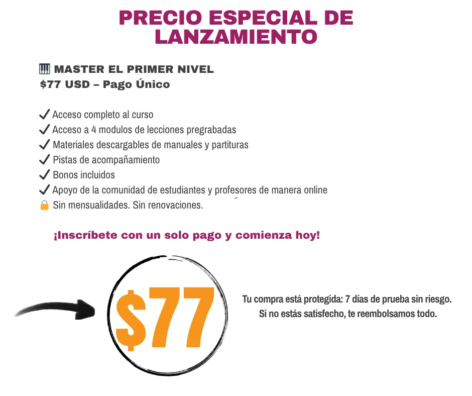 Con una sola inversión, obtienes acceso completo e ilimitado a todo el contenido de Piano Master Nivel 1. Podrás estudiar a tu propio ritmo, revisar las lecciones cuando quieras y aprovechar todos los recursos disponibles sin restricciones. Este acceso te acompaña para siempre, dándote la libertad de aprender y practicar sin prisas ni límites de tiempo.